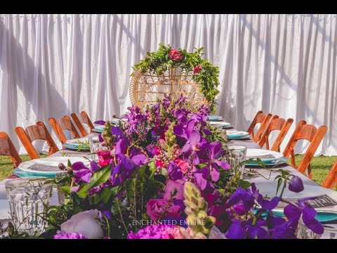 With a subtle nod to the majestic peacock colour palette of purples, teals and shades of turquoise, this Bohemian styled Hen’s Party was accented by rustic wood finishes and highlighted with a hint of copper. Thick and lush florals ran the length of the table, complimented by copper mercury tealight votives transforming the space into an elegant and relaxed celebration. Set on private property in a clear marquee, this event was truly brought to life at dusk when the glow of meticulously strung festoon lighting and the glimmering glow of candlelight added the perfect finishing touch.