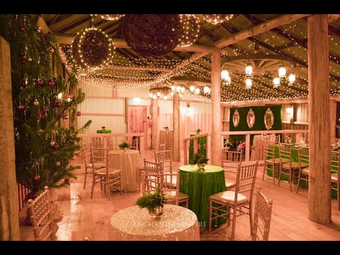 There is nothing quite like Christmas in the country. Gathering with family, friends and community. Set in a lovingly restored barn, of textured wooden and custom country elements, the draped fairy light canopy shined and added to the warm welcoming feel of the venue. Reflective sequin linens in emerald & champagne, captured the twinkling lights from above perfectly, for that extra bit of Christmas glow. Natural elements of pine and holly were used throughout the table styling and classic touches of Christmas decor complimented the real Christmas tree. Our Graphics team designed custom hand-drawn chickens, with cute Christmas elements, which were suspended on faux green walls bringing a little outside in and providing the perfect backdrop for the lounge space, whilst giving a subtle nod to the clients being free-range chicken farmers. Gold charger plates, cutlery, stunning emerald green satin napkins and custom menus designed by our team concluded the table styling and ensured an immersive & festive environment for all guests.