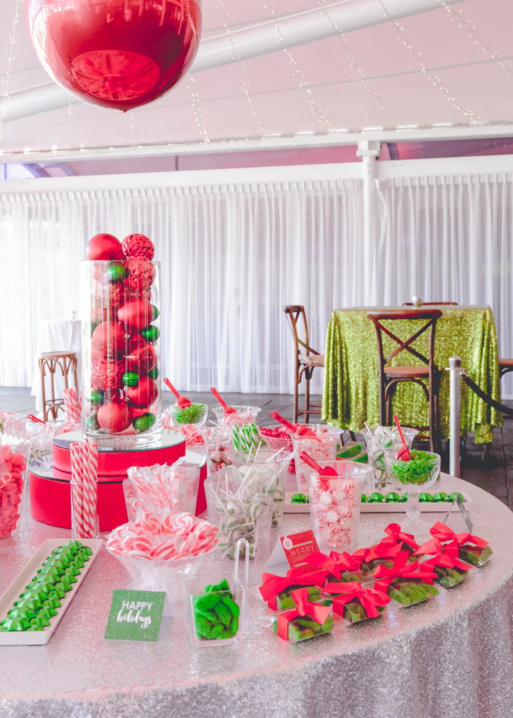Under a stunning chandelier of hanging foiled green, red + silver baubles suspended in the centre of a stunning warm white fairylight canopy sat this delicious festive treat station. An array of vases offered up festive coloured sweet treats to this corporate crowd. With many custom elements from our in house graphics team consisting of printed + packaged jelly beans in takeaway Xmas tree packs + tent fold candy cards. Positioned in the centre of the event space this enticing candy station was a huge hit with all guests.