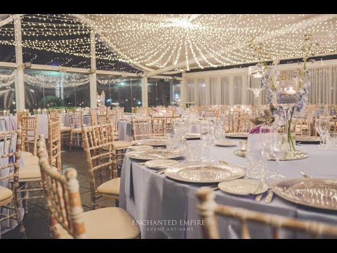 With a cascading Fairy Light Canopy, this elegant pastel watercolour wedding was sure to impress guests. Soft lilac hues draped the tables in smooth satin tablecloths, with powder blue satin napkins and silver beaded charger plates used to frame each guest place setting. Elegant watercolour table numbers, custom designed in-house by our Graphics Team, beautifully placed within our clear acrylic frames. The decor was styled to compliment the elegant and beautifully hued purple flowers adorning each table in alternate high and low arrangements. Ambience was created on the table with silver mercury tealight votives, beautifully finished with the rustic charm of Limewash Tiffany Chairs.