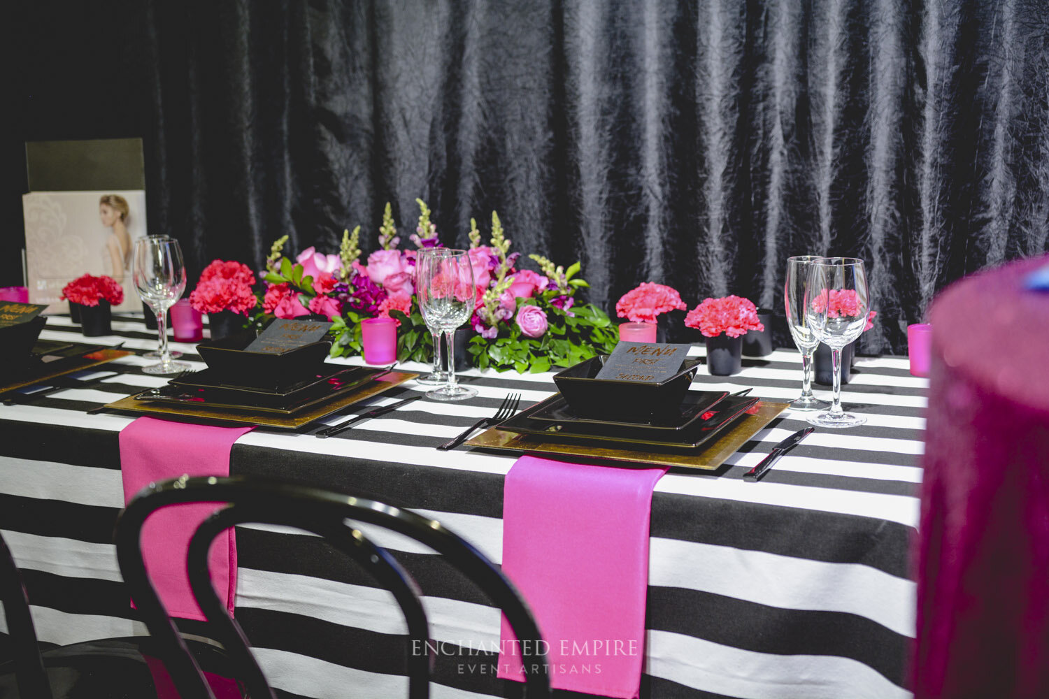 Showcasing at the local wedding expo, Hotel Urban wanted to capture their potential couples with a bright and bold expo booth to match in with the modern and sleek branding of Hotel Urban. Showcasing their iconic black and white monochrome feature wall within the hotel, we used thick bold striped linen and clean black bentwood chairs as a strong base. Adding hot pink, magenta and deep fuchsia florals, designed by our in-house floral artisans, to incorporate the hotel’s fresh and bright branding elements. A black crushed taffeta backdrop allowed the colours to really stand out and help draw out the copper foiled menus on black card, designed by our Graphics team. A hot pink sequin dry bar added to the glamour and modern touches to this corporate clients booth.