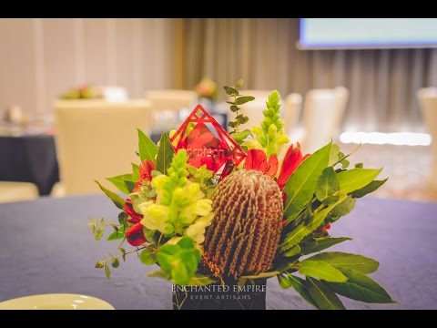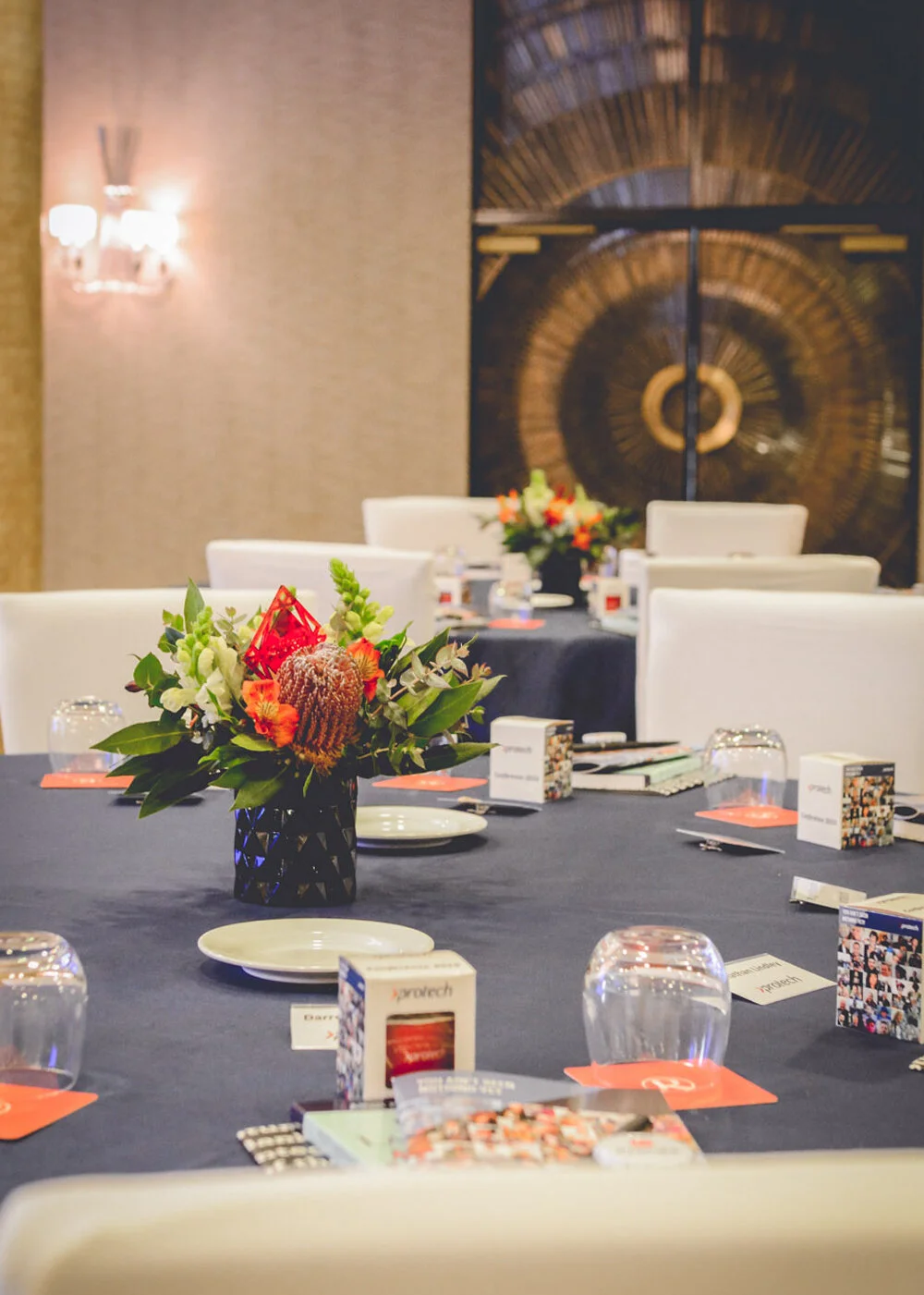 Protect held their Annual Business Conference at the Rydges Hotel Southbank, working with the neutral backdrop of the venue, our clients chose to accentuate Corporate Branding with Navy Crushed Taffeta Tablecloths working as the base. Australian Native floral arrangements with custom designed laser cut acrylic floral accents created by our graphics team, were incorporated to bring additional colour and branding to the beautiful arrangements assembled by our in house floral artisans.