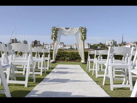 A classic ivory and crisp white base was the emphasis for this stunning wedding ceremony. Set in front of the beautiful Brisbane River, this location made for a great natural backdrop and set the romantic scene for the ceremony perfectly. The rustic wooden arbour designed and made by our props team, was elegantly draped in a sheer ivory chiffon and framed gracefully by our in-house floral artisan’s cascading creations of cream roses, white seasonal florals and touches of Australian Eucalyptus foliage to compliment this elegant and sophisticated theme.