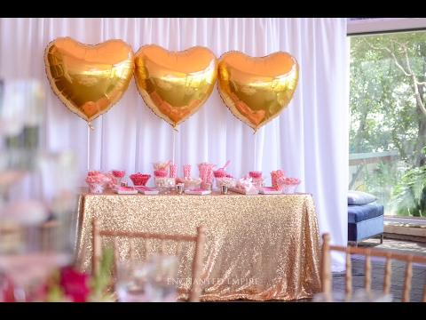Styled on a crisp white base, this wedding decor was simple and chic. White tablecloths with gold tiffany chairs to create an elegant setting, whilst beautiful soft pinks and rich burgundy florals complimented the gold mercury tealights and stemmed floating candles. Guests were treated to a beautiful Dessert Bar of gold sequin and an array of pink-hued sweets. Custom chocolate wraps were designed in-house by our Graphics Team which accent perfectly the finer styling details put together by our creative event team. The decor was finished with gorgeous gold love heart geronimo balloons for that fun yet romantic element to the dessert table decor.