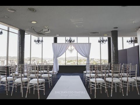 This stunning classic white wedding was held in the elegant inner city venue, Hotel Urban. With a full view of the city skyscrapers that draws your eye around to the Roma Street Parklands and then onto the gorgeous Mount Cootha ranges, it really makes for a stunning backdrop to exchange vows. Our expert stylists selected white limewash chairs to perfectly frame the modern and chic white aisle runner that leads onto a crisp white draped arbour complete with an elegant 5 light chandelier to set the mood. Simple, elegant and leaves a lasting impression on guests as well as having the perfect backdrop for those beautiful ceremony photos.