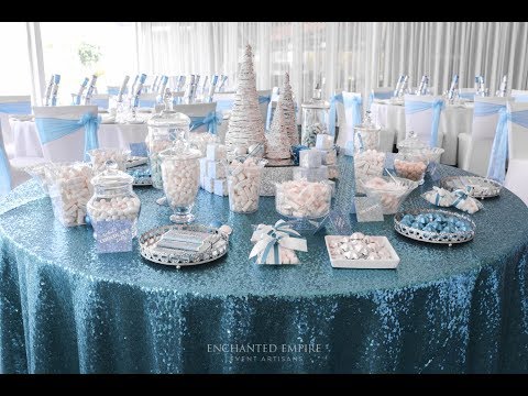This Winter Wonderland corporate Christmas dinner really came to life after sunset, with a draped canopy of cascading white fabric, hanging snowflakes, hundreds of warm white fairylights + a cluster of illuminated star lanterns. In the center of the dining space, upon a wintery turquoise sequin tablecloth, sat a delicious in-theme candy bar with many custom graphic accents including custom wrapped chocolate bars, mini marshmallow squares with snowflake labels and tentfold candy name cards. In the center of the table sat a complimenting mirror topped silver sequin riser which in the evening perfectly reflected the light of the lanterns above. A cluster of white wicker Christmas trees surrounded by decorative Christmas baubles adorned the table and ensured the style of the entire dining room tied together cohesively.